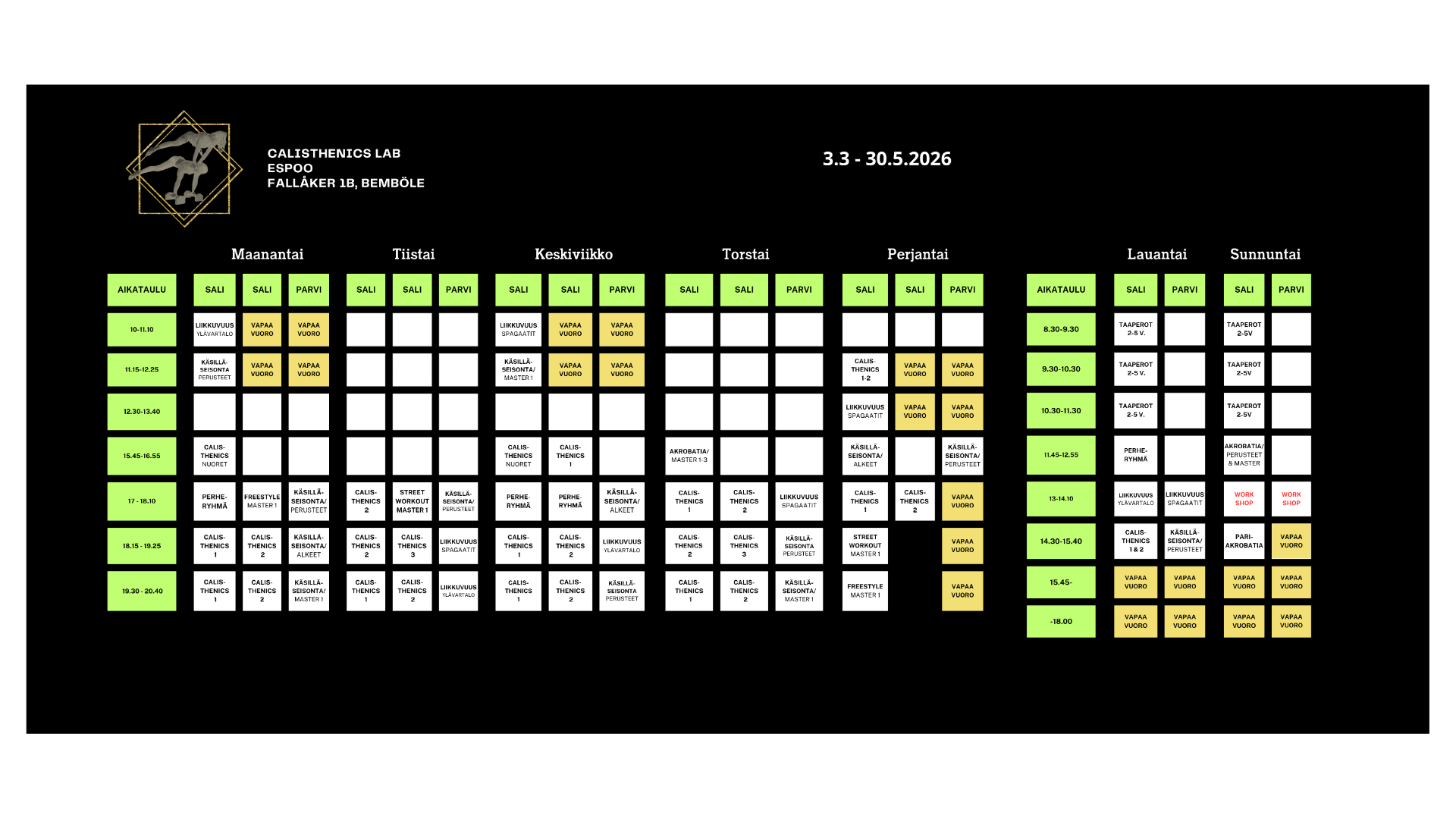 Calisthenics Lab sijaitsee Espoon Bembölessä osoitteessa Fallåker 1 B. Salimme on viihtyisä, korkea, valoisa ja kompakti 200 neliöinen tila, josta löytyy mm. rekkejä, nojapuita, joustopermanto, trampoliineja sekä vaahtomuovimeri, jonka yllä on rekki ja johon pääsee myös trampoliinilta harjoittelemaan alastulotemppuja ja voltteja.